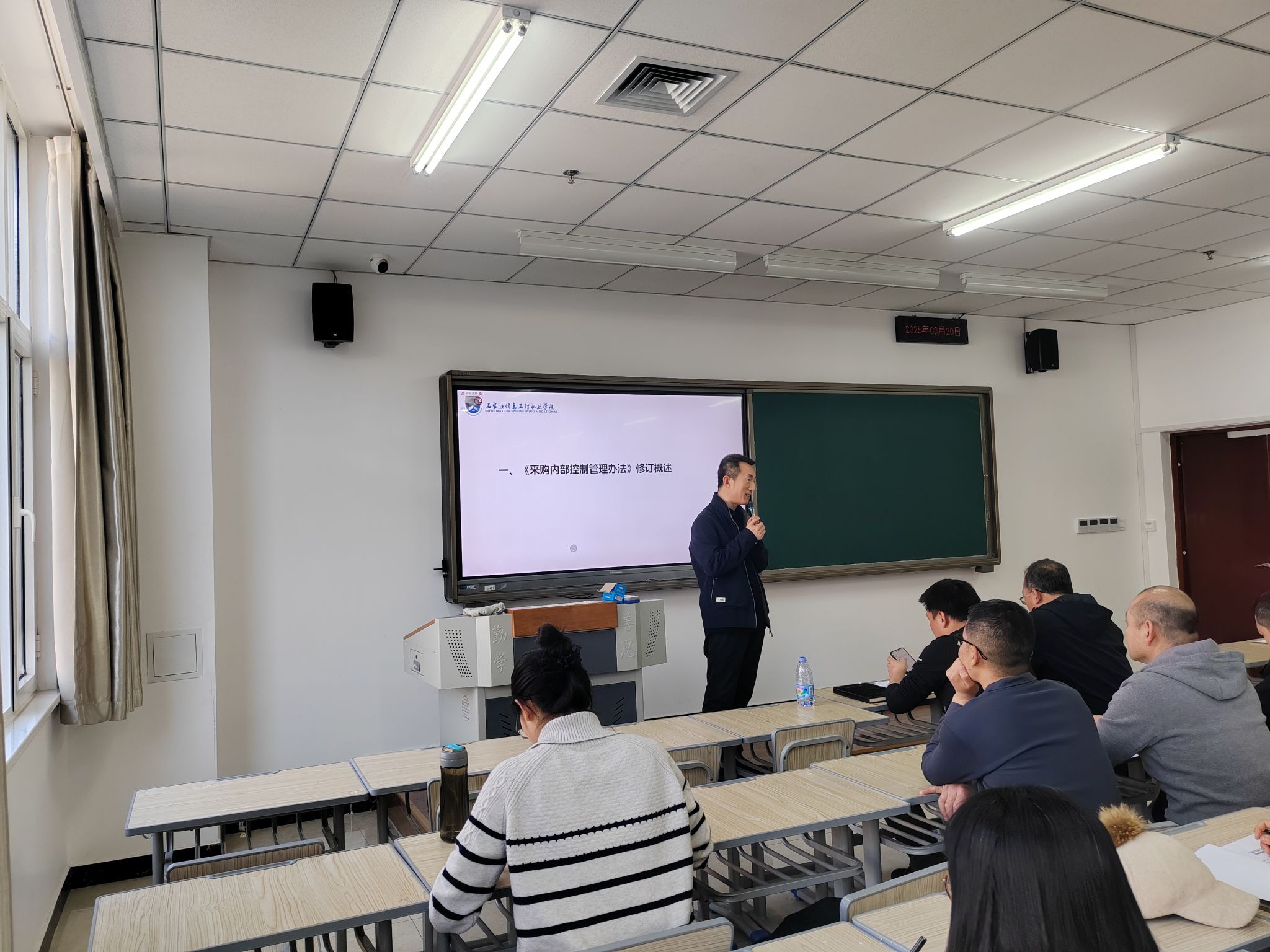李新在培训中详细讲解了学院内部控制管理办法适用的采购活动、遵循的原则、采购的形式以及采购需求的编制要求等内容。