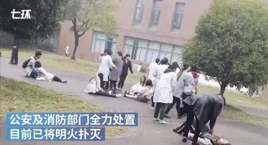 现场图片显示,一房间房屋的窗户往外冒着白烟,房屋前的空地上有多名身穿白色大褂的学生躺、坐在地上。经了解,事故发生时师生正在实验室进行萃取实验。