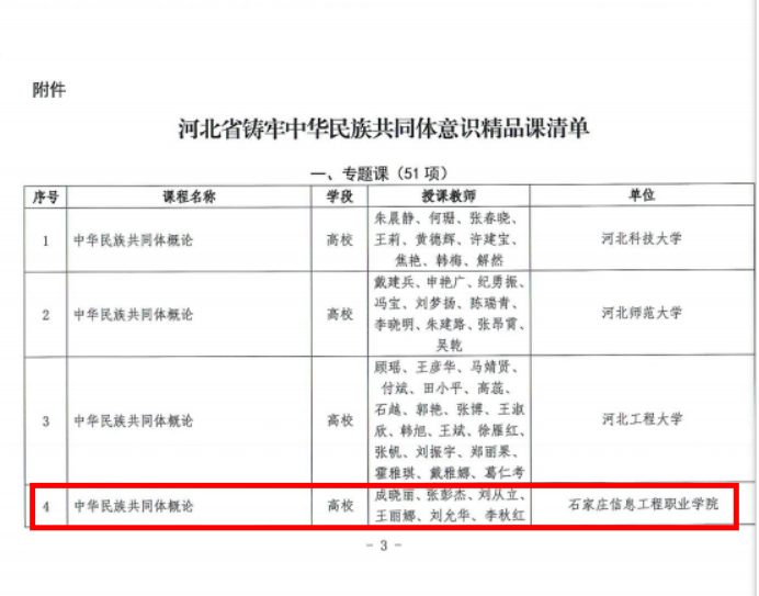 近日,按照《教育部办公厅关于征集铸牢中华民族共同体意识精品课的通知》要求,河北省教育厅组织开展铸牢中华民族共同体意识精品课征集遴选,创建一批省级精品课,AC米兰马克思主义学院选送的《中华民族共同体概论》专题课成功入选河北省省级精品课。