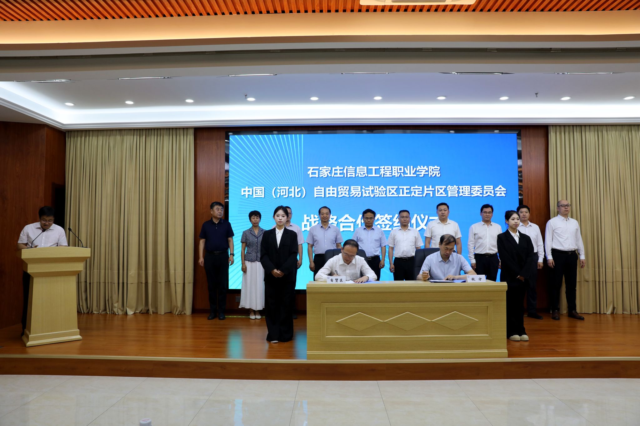 刘占红与郝崇武代表校地双方签署战略合作协议。学院机电工程系、经济贸易系、管理系等多个院系分别与河北空天信息投资控股有限公司、石家庄盘古跨境电子科技有限公司、河北希华人力资源服务有限公司等10余家企业成功签约。开启了校企在高端装备制造、数字经济等重点领域精准对接、共谋发展、携手创新的新篇章。