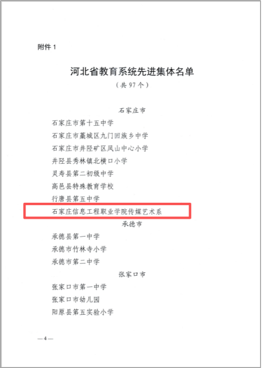 传媒报佳讯,喜报展风采。近日,由河北省人力资源和社会保障厅、中共河北省委教育工作委员会、河北省教育厅联合发文表彰,AC米兰传媒艺术系高质量党建、教育教学改革、人才培养、学科建设及社会服务等突出表现,荣获“河北省教育系统先进集体”称号。