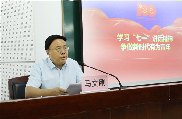 马文刚以《学习“七一”讲话精神 争做新时代有为青年》为题,系统阐述了习近平总书记“七一”重要讲话的重大意义、丰富内涵和实践要求,引导师生从“铸就了一个重要里程碑、贯穿了一个主题、昭示了一条道路、蕴含了一种精神、擘画了一个宏伟目标”五个方面学习、理解和领会“七一”讲话精神,汲取强大精神力量。他指出,深入学习领会习近平总书记重要讲话精神,就要深入理解讲话的理论逻辑、历史意义、现实价值和精神力量。既要有宏观的把握,又要有微观的体悟。