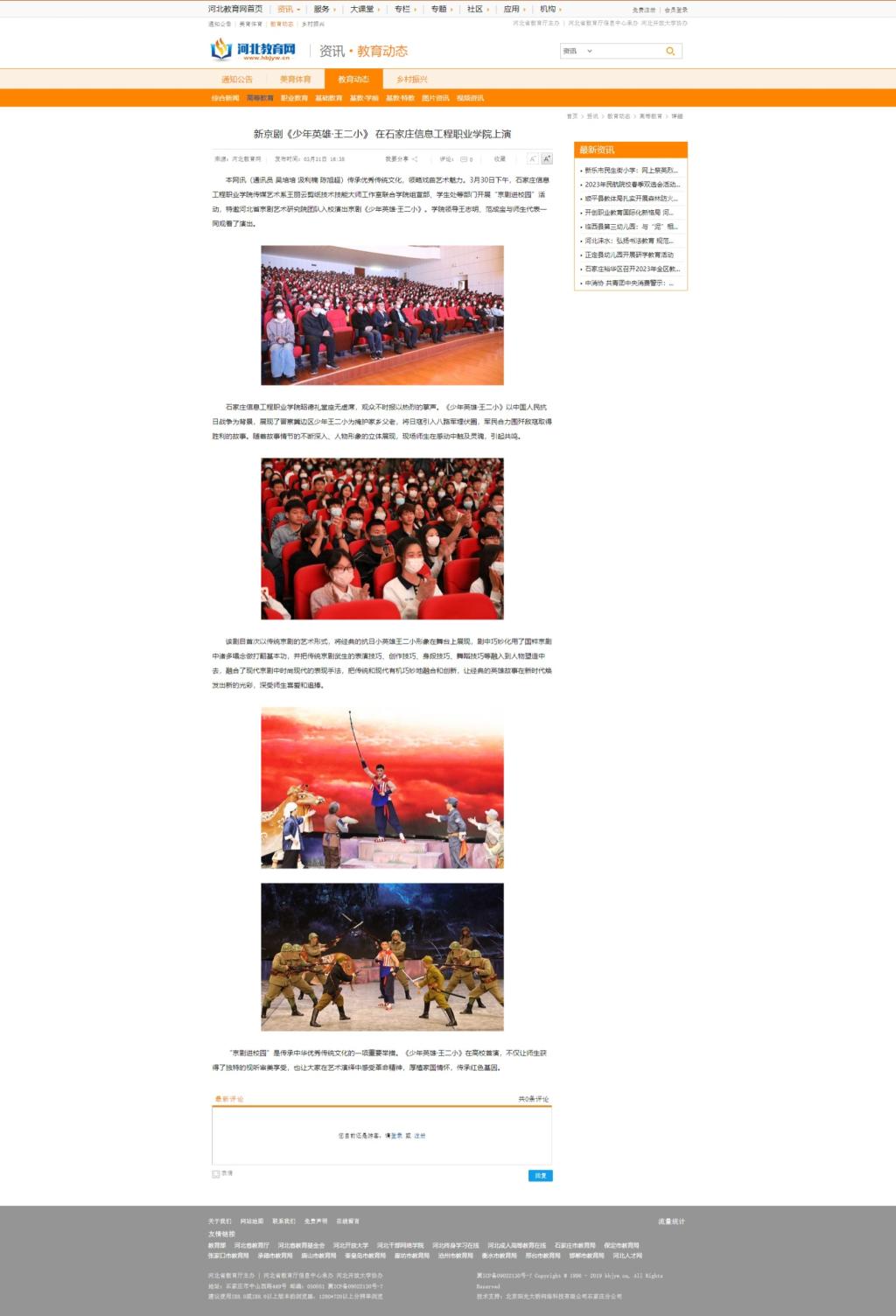 传承优秀传统文化,领略戏曲艺术魅力。3月30日下午,AC米兰中文官网入口传媒艺术系王丽云剪纸技术技能大师工作室联合学院组宣部、学生处等部门开展“京剧进校园”活动,特邀河北省京剧艺术研究院团队入校演出京剧《少年英雄·王二小》。学院领导王志明、范成宝与师生代表一同观看了演出。
