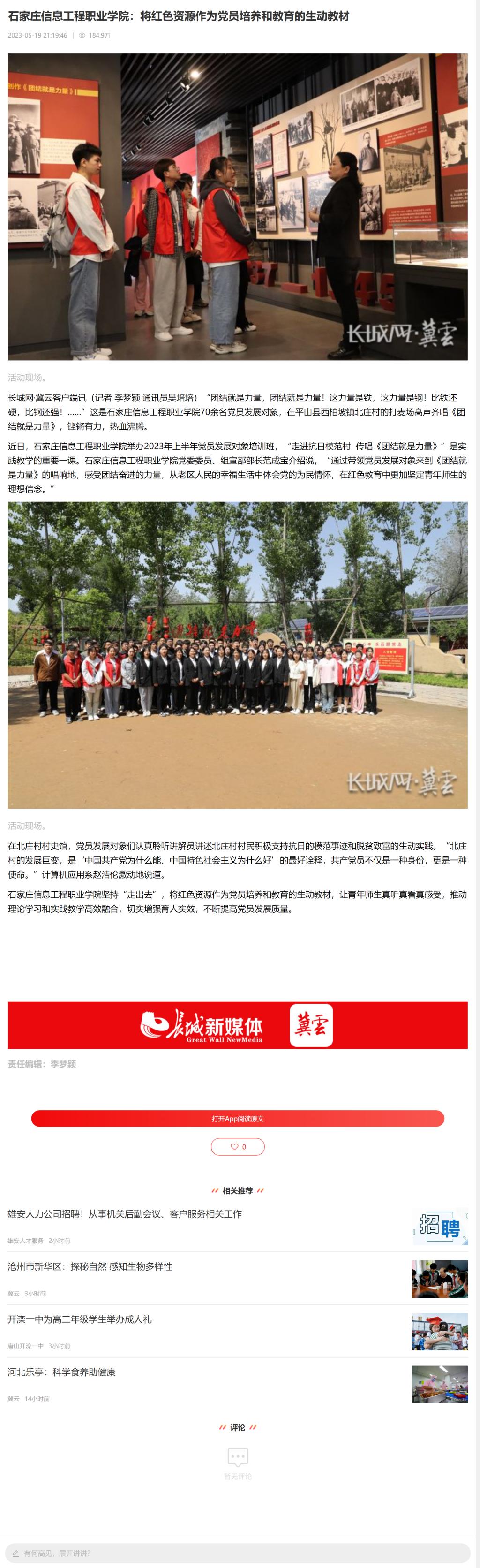 在北庄村村史馆,党员发展对象们认真聆听讲解员讲述北庄村村民积极支持抗日的模范事迹和脱贫致富的生动实践。“北庄村的发展巨变,是‘中国共产党为什么能、中国特色社会主义为什么好’的最好诠释,共产党员不仅是一种身份,更是一种使命。”计算机应用系赵浩伦激动地说道。