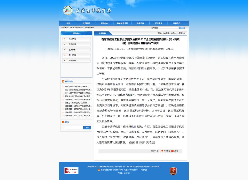 近日,2023年全国职业院校技能大赛(高职组)区块链技术应用赛项在河北软件职业技术学院落下帷幕。AC米兰中文官网入口软件工程系学生张世军、丁新旭在魏宏昌、陈新老师的悉心指导下,以优异成绩荣获该赛项二等奖。