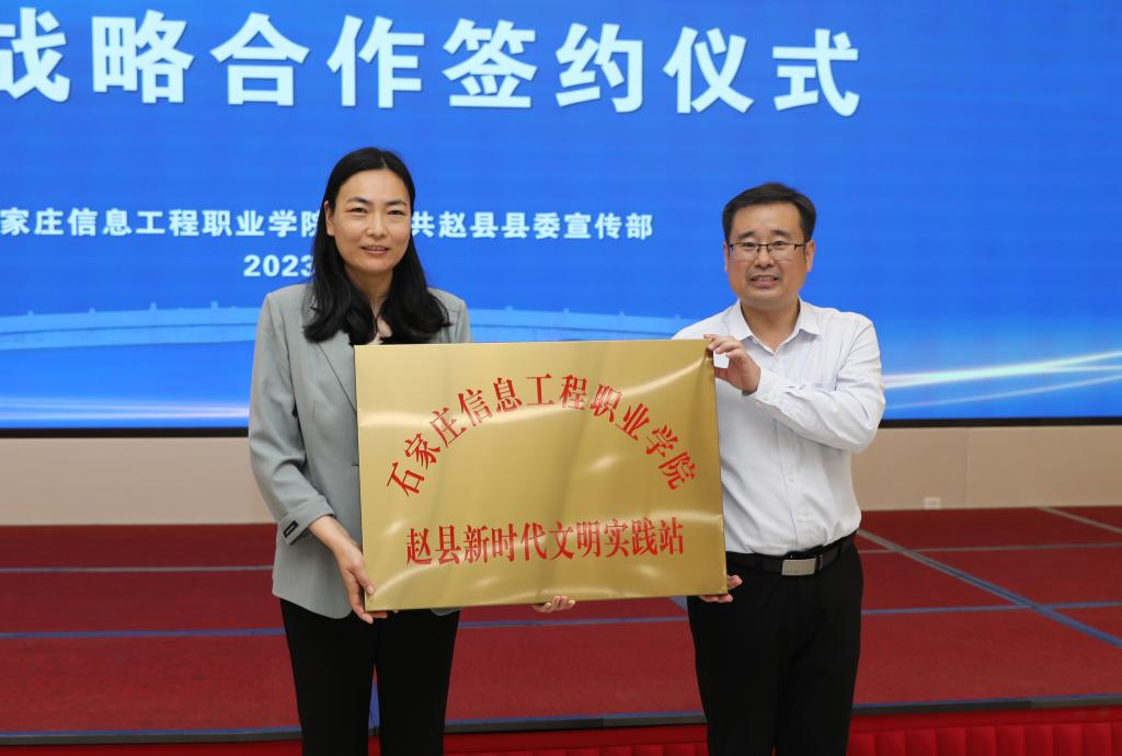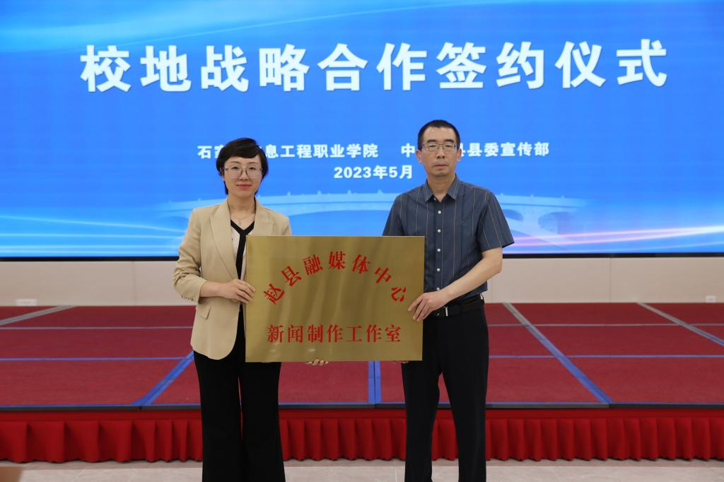 王建立向传媒艺术系书记张婷授“AC米兰中文官网入口赵县新时代文明实践站”牌匾。徐哲普向传媒艺术系主任袁立敏授“赵县融媒体中心新闻制作工作室”牌匾。