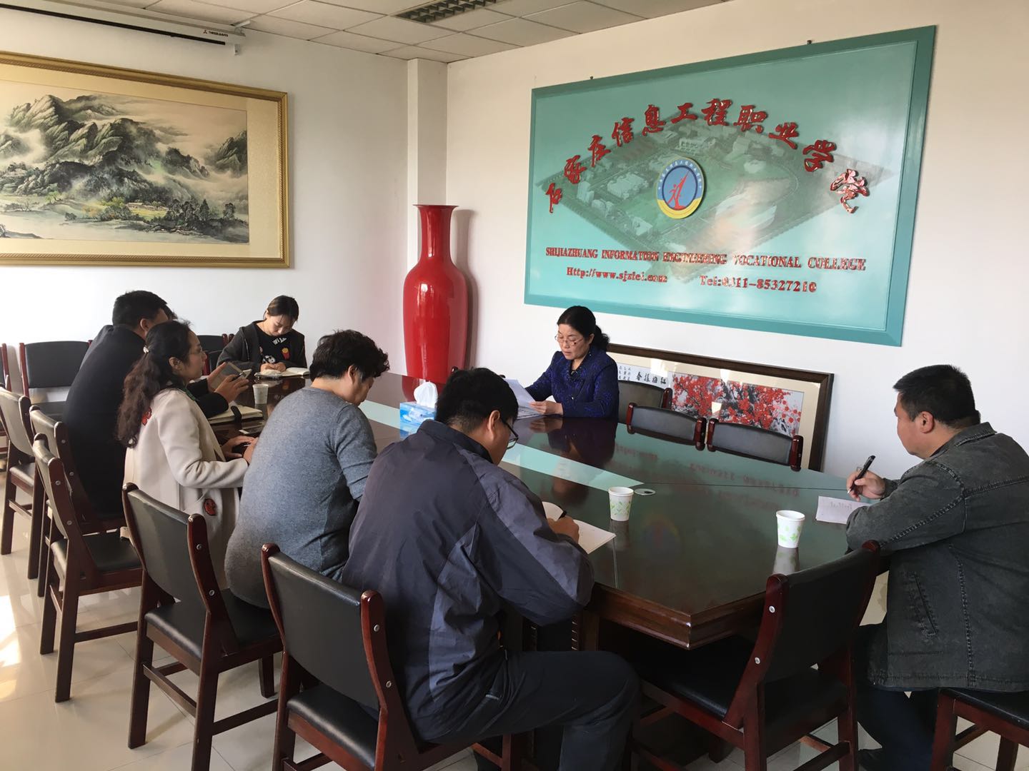 2017年11月3日上午,学院纪委在行政服务中心楼二楼会议室召开了纪委一届九次会议。深入学习了中央、省市纪委关于落实党的十九大精神,并对下半年纪委工作进行了安排部署。纪委书记赵惠娟主持了会议。