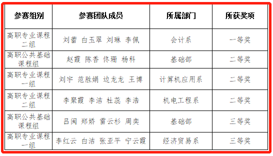 本次大赛获奖是学院深化教育教学改革,积极探索“岗课赛证”融合育人模式的重要成果。自赛事启动以来,学院领导高度重视、全力支持,教务处精心组织、积极谋划,各系(院、部)积极动员、广泛参与,经由系部推荐、专家评审、学院选拔、重点打造等环节,最终有6个参赛队伍在27个选拔队伍当中脱颖而出。在比赛准备过程中,各参赛教师团队不辞勤劳、刻苦钻研,牺牲假期时间精心打磨、通力协作,展现出专业的知识储备,良好的精神风貌以及过硬的综合教学素质,最终取得了优异的成绩。
