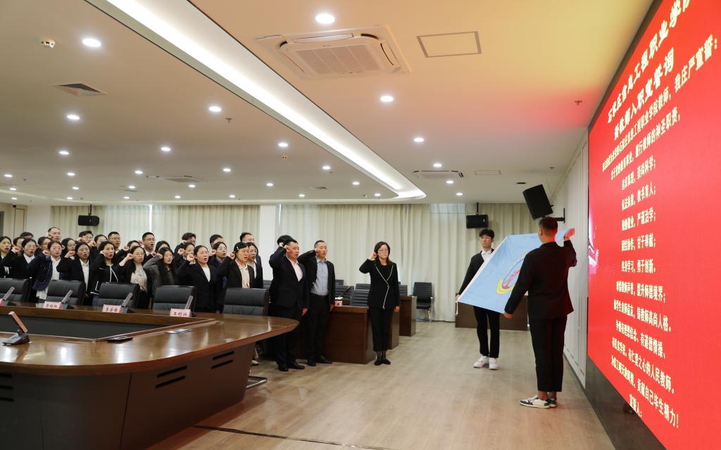 32名新入职教师面向校旗进行入职宣誓,新入职教师代表刘凯欣表示将时刻保持学习的态度,不断提升自己的专业水平和教育教学能力,为国家培养出更多的优秀人才。