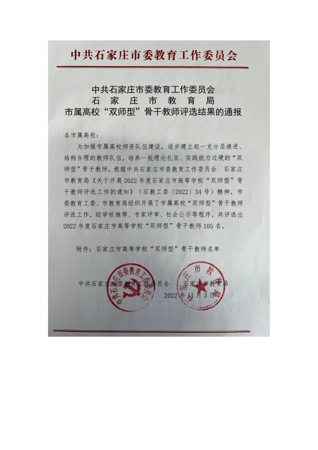 市属高校“双师型”骨干教师评选结果的通报