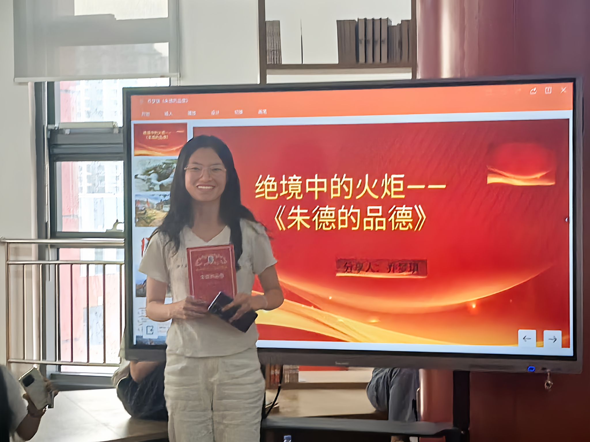 分享环节中,同学们以饱含深情的讲述,将红色经典中的精神力量娓娓道来。有同学沿着《青春之歌》中林道静的成长轨迹,深度解读革命青年在时代浪潮中坚定的理想选择;有同学读完《朱德的品德》一书后,深深为朱德同志一生坚守艰苦朴素与实事求是的精神所折服;有的同学以《红星照耀中国》为切入点,生动讲述共产党人不畏艰险、不懈奋斗的感人故事,深刻阐释“为人民谋幸福”的初心使命。当分享者声情并茂地讲述《红岩》书中“江姐狱中绣红旗”的感人细节时,掌声经久不息,红色精神引发全场强烈共鸣。