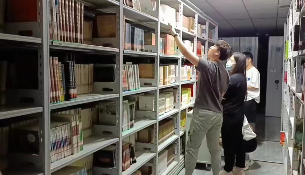 老师指导同学在密集书库挑选图书