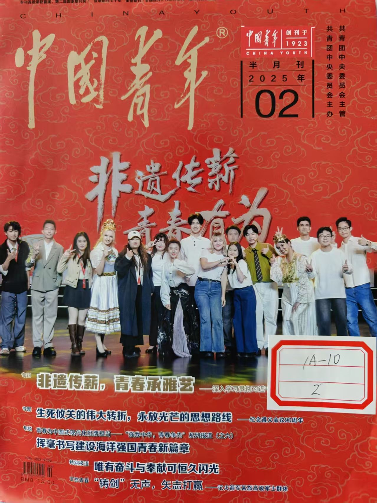 2025年第2期的《中国青年》收录了文章《非遗传薪,青春承雅艺》——深入学习贯彻习近平文化思想(之五),文章讲述了太极拳世界冠军、青年自媒体创作者、彝绣非遗传承人、《黑神话:悟空》配音说唱者、非遗展馆青年讲师等不同岗位的非遗爱好者、传承者,他们展示着非遗,讲述着非遗,在一代又一代人的热血与坚守下,古老的非遗在新时代绽放璀璨光芒,年轻的筑梦者正以自己的方式让这份文明瑰宝生生不息。